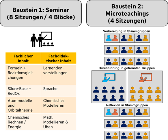 Das Seminar wird in enger Zusammenarbeit zwischen einem wissenschaftlichen Mitarbeiter der Chemiedidaktik und einem abgeordneten Seminarlehrer konzipiert und durchgeführt, um Perspektiven aus den ersten beiden Phasen der Lehrkräftebildung zu vereinen und die Studierenden ultimativ besser auf die späteren Bedarfe ihres Berufsfelds vorzubereiten.